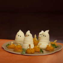 Un contorno spiritoso? Nella danza dei fantasmi i fantasmini sono formati da purè di patate versato con una tasca da pasticcere, con i semi di sesamo a formare gli occhi.