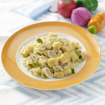 Per i primi prepara degli gnocchi di zucca con funghi: gli gnocchi di patate sono avvolti da un cremoso sugo di champignon, porri e robiola.