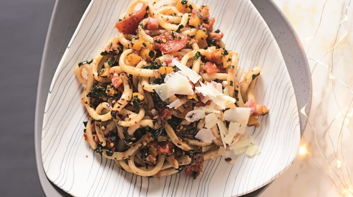 2) Scaldate una casseruola dal fondo spesso, unite il guanciale e cuocetelo su fiamma media fino a quando inizia a dorare. Unite la cipolla, il sedano e la zucca, aggiungete i pomodori pelati spezzettati, regolate di sale e cuocete le verdure coperte per 7-8 minuti. Unite il cavolo, un pizzico di peperoncino e cuocete ancora per 5 minuti.
