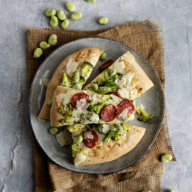 Una versione primaverile con mozzarella, fave e salame piccante. Buona anche fredda per una gita fuori porta