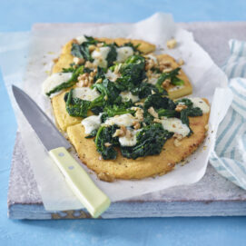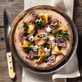 L'impasto è preparato con farina integrale e farcito con fette di salama da sugo, pere, spinaci e squacquerone. Una proposta insolita come piatto unico o da condividere con gli amici