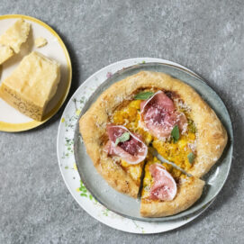 Colorata, golosa e leggera: questa pizza con impasto integrale è guarnita con un formaggio grana Dop, prosciutto sapido e zucca estiva