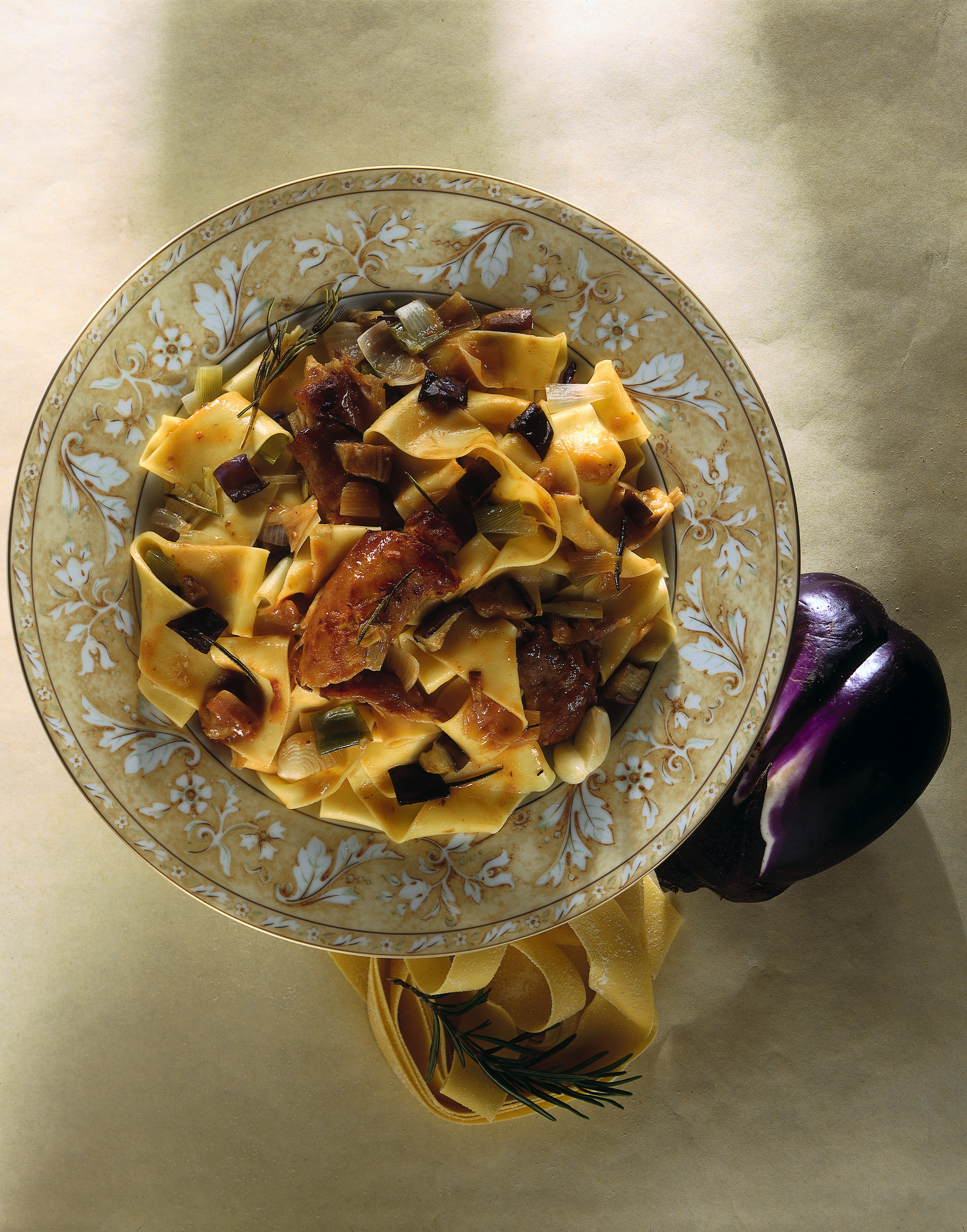In Toscana si dice proprio così: "Pappardelle sull'anatra, sull'oca, sulla lepre, sul coniglio", piuttosto che "con il coniglio o al coniglio". E' proprio l’articolazione a fare la differenza. Qui si intende proprio l’animale da cortile come fulcro del discorso, come “personaggio principale”, che ovviamente regala una tonalità diversa al piatto che viene messo in tavola.