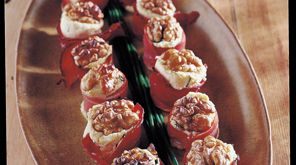 2) Forma con l'impasto dei cilindretti, avvolgi ognuno in mezza fetta sottile di speck, disponi sulla sommità dei bocconcini un gheriglio di noce e servi i bocconcinidi speck e ricotta a temperatura ambiente.