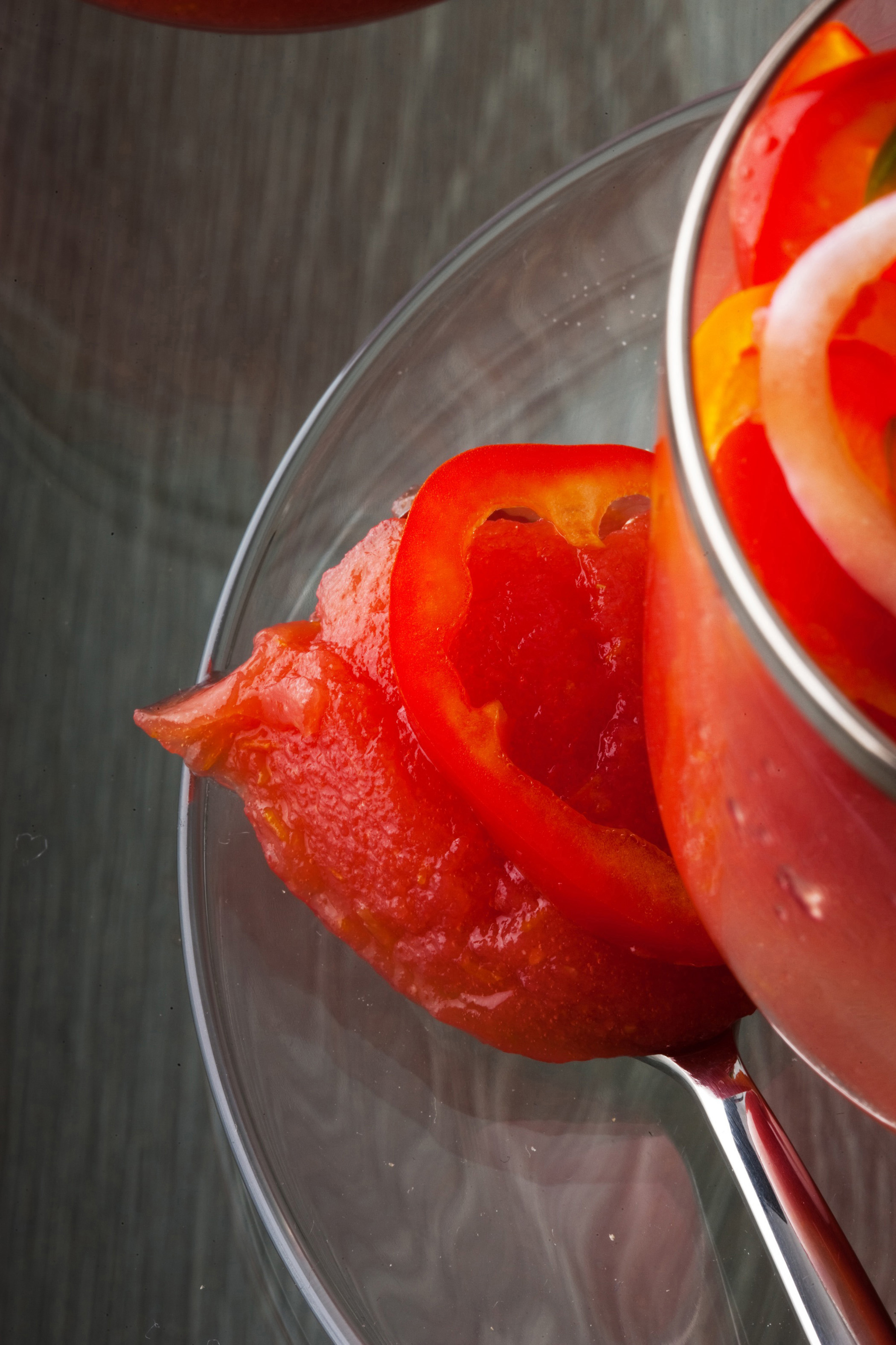 1) Inizia la preparazione della gelatina di gatzpacho con insalata di peperoni sbollentando i pomodori per 30 secondi in una pentola d’acqua sul fuoco che sia già in ebollizione, poi immergili in acqua fredda, sbucciali ed elimina i semi; quindi frullali con l'aglio pestato con qualche grano di sale grosso e 2 cucchiai di aceto fino ad ottenere un composto omogeneo e spumoso. Grattugia la cipolla ma tieni da parte qualche anello, avvolgila in un panno e strizzala facendo colare il succo nella polpa di pomodoro oppure tritala in modo da farla diventare una crema.