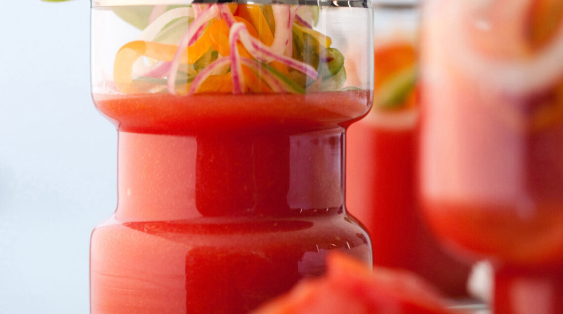 2) Continua la preparazione della gelatina di gatzpacho con insalata di peperonisciogliendo l'agar in 200 ml di acqua portata a ebollizione e aggiungi il liquido al pomodoro. Aggiusta con sale, pepe e versa il gatzpacho ottenuto in 4 bicchieri, lascia raffreddare il composto e poi riponilo in frigo per almeno 2 ore.