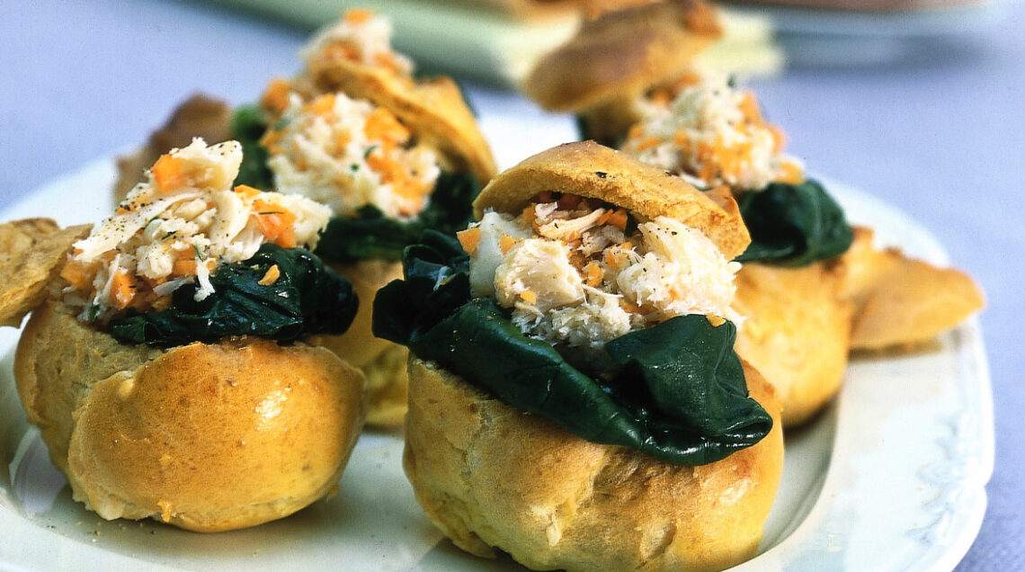 3 Tagliate la calotta dei bignè e farciteli aiutandovi con una sac-à-poche con bocchetta grande: piegate verso l'esterno a metà altezza i bordi della sacca e mettetevi il composto di spinaci e polpa di granchio; risollevate i bordi, farcite i bignè, cospargeteli con una macinata abbondante di pepe e servite.