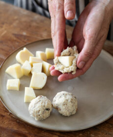 Tagliate il formaggio a cubetti di circa 2 cm di lato e metteteli in freezer su un vassoio ricoperto con un foglio di carta da forno. Intanto tritate il pane (eliminate le parti più dure della crosta) e raccoglietelo in una ciotola; unitevi 100 g di farina, un pizzico di sale e di pepe e mescolate con cura; quindi versatevi circa 2 dl di acqua e amalgamate bene gli ingredienti. Prelevate circa 1 cucchiaio di composto e formate una polpetta schiacciata tra le mani; mettetevi un cubetto di formaggio al centro e richiudetela. Procedete allo stesso modo fino a esauire l'impasto, poi passate le polpette nella farina rimasta, scuotendone l'eccesso.