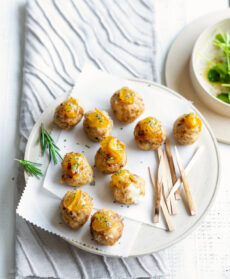 Scaldate abbondante olio in un tegame, friggetevi le polpette finché saranno dorate uniformemente e scolatele man mano su carta da cucina. Mettete su ciascuna polpetta 1/2 cucchiaino di marmellata, completate con un pizzico di rosmarino tritato e servite.