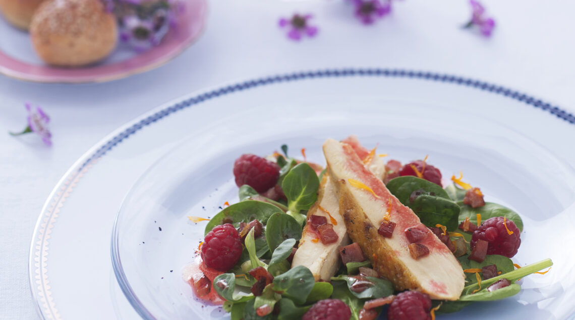 3) Successivamente lava gli spinacini e l'insalata e mescolali ai lamponi sciacquati; disponili nei piatti e aggiungi un pizzico di sale. Fai soffriggere lo speck in una padella antiaderente senza condimenti, spruzza un poco di aceto e il vino e lascia sfumare il tutto.