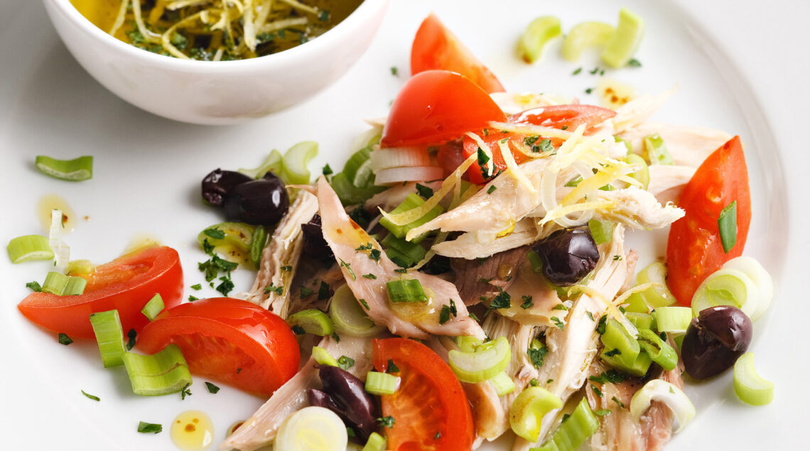 2) Taglia il petto a striscioline, mettile in una terrina e mescolaci gli anelli di cipollotto, gli spicchi di pomodoro, 1 cuore di sedano a fettine, ed aggiungi infine qualche olivetta nera.