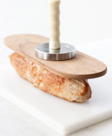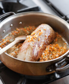 A cottura ultimata, scolate il magatello dal sugo di cottura, sistematelo su un piatto, appoggiatevi un tagliere con un pestacarne (o un altro peso) e lasciatelo raffreddare: in questo modo la carne risulterà più compatta. Passate al passino fine il fondo di cottura.