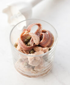 Scolate il tonno e i filetti d'acciuga dall'olio di conservazione, trasferiteli nel bicchiere di un frullatore a immersione (oppure di un normale frullatore), unite i capperi scolati dall'aceto e frullate a intermittenza fino a ttenere un impasto abbastanza omogeneo.