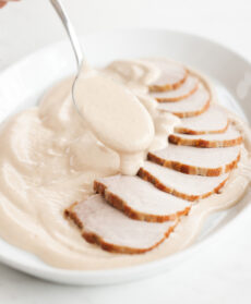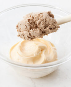 Raccogliete la maionese in una ciotola e incorporatevi il frullato di tonno amalgamandolo bene con un cucchiaio di legno; completate la salsa con 2 cucchiai del fondo di cottura della carne: dovrà risultare fluida e vellutata.