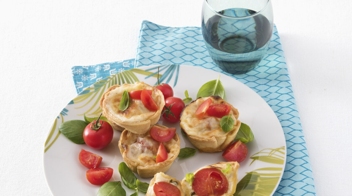 3) Sforna i cestini di brisée, disponi in ognuno 1 pomodoro, completa con la fonduta al formaggio preparata e trasferisci di nuovo in forno a 180° per 15 minuti. Servi completando con le foglie di basilico.