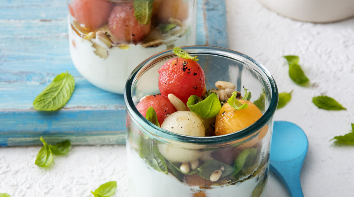Bicchierini di burrata con anguria, melone e pinoli tostati
