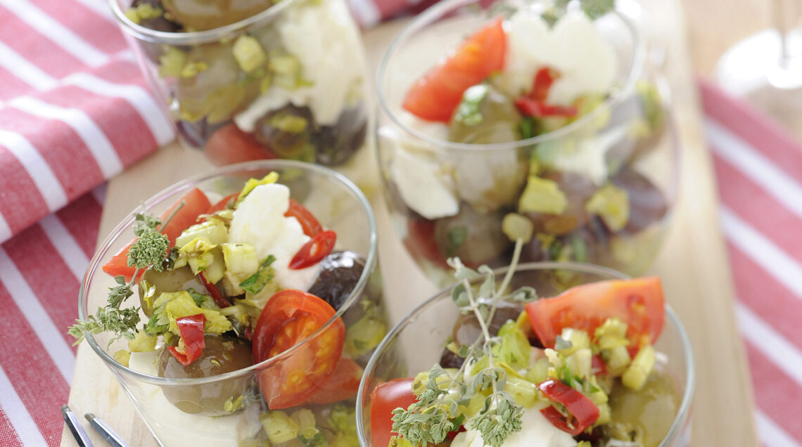 1) Per preparare la velocissima ricetta dei bicchierini con olive pugliesi e burrata, pulisci, lava e trita grossolanamente il sedano e trasferiscilo in una ciotola, poi lava i pomodori ciliegini e tagliali in spicchi piccoli. Dopodiché sminuzza il peperoncino fresco, sgocciola le olive verdi e nere dalla salamoia e uniscile al sedano, poi insaporisci con abbondante origano, un po’ di peperoncino e l’olio extravergine d’oliva. Infine mescola bene, copri con la pellicola e lascia insaporire per 6 ore al fresco.