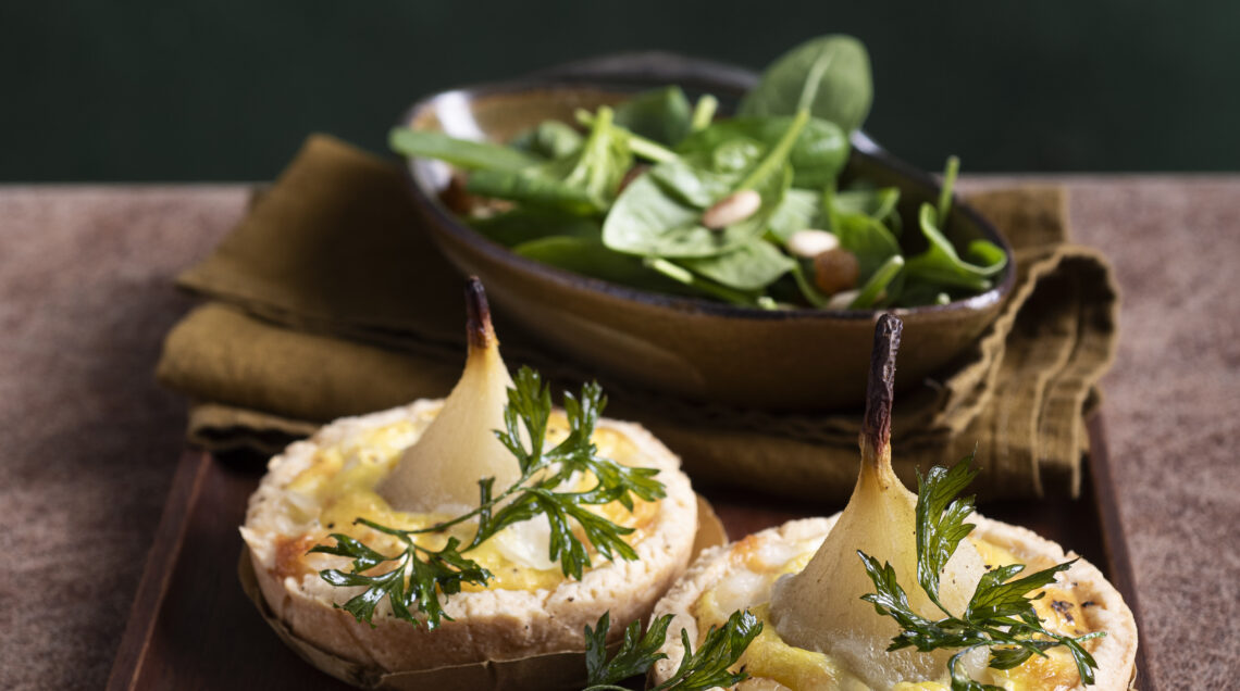 4 Tagliate la base delle pere di circa 1 cm e posizionatene una in ogni crostatina; riempite i gusci con il composto di uova e formaggio e infornate a 180° per 20 minuti.
