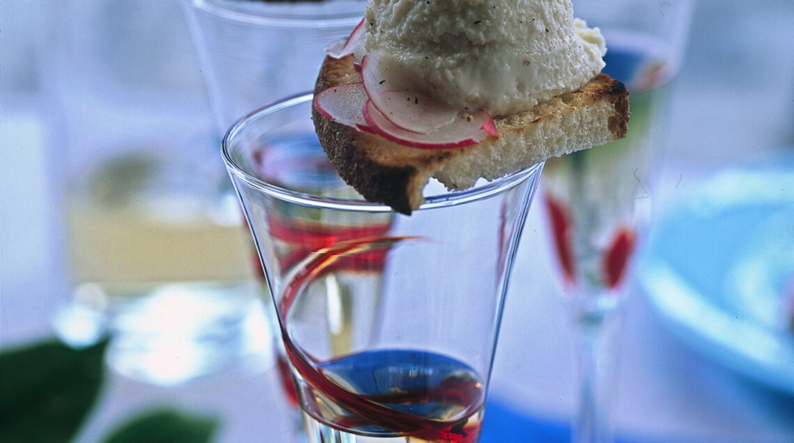2) Lava i ravanelli, asciugali e affettali in fettine sottili. Servi il gelato di parmigiano a palline sui crostini di pane e decora con le fettine di ravanello spolverizzando il tutto con poco pepe macinato al momento.