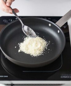 In una pentola antiaderente versa piccole quantità di Grana Padano 16 mesi (circa 20 g alla volta, che equivalgono a due cucchiai) e distribuiscilo uniformemente all'interno della padella. Lascia fondere il formaggio sino a quando, dopo aver formato delle bollicine, si sarà dorato con l'aiuto di una spatola stacca la cialda dal fondo della padella e girala facendo dorare anche l’altro lato. Ripeti questa operazione sino a terminare tutto il formaggio.