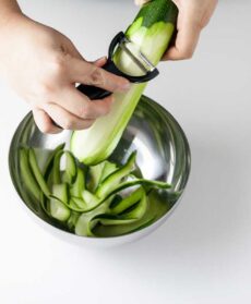 Mentre gli agretti sono in cottura con una mandolina taglia la zucchina a fettine molto sottili. Una volta pronte le verdure condiscile con un filo di olio extravergine di oliva, un pizzico di sale e pepe.