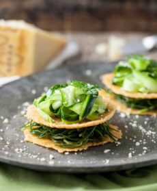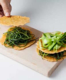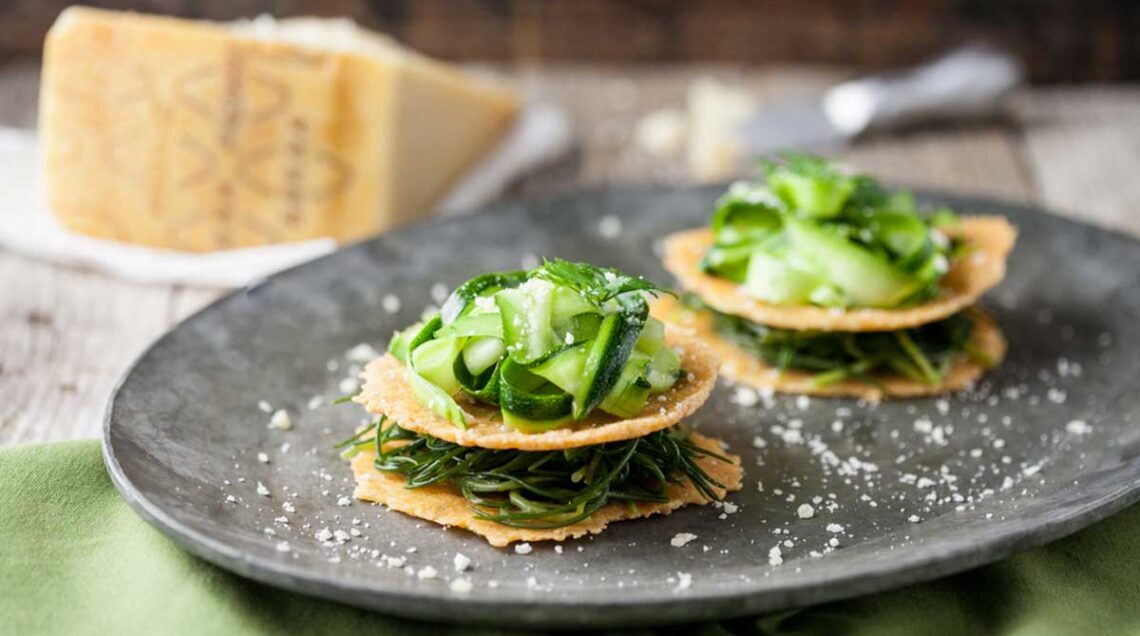 Servi le millefoglie di cialde di Grana Padano con verdure.