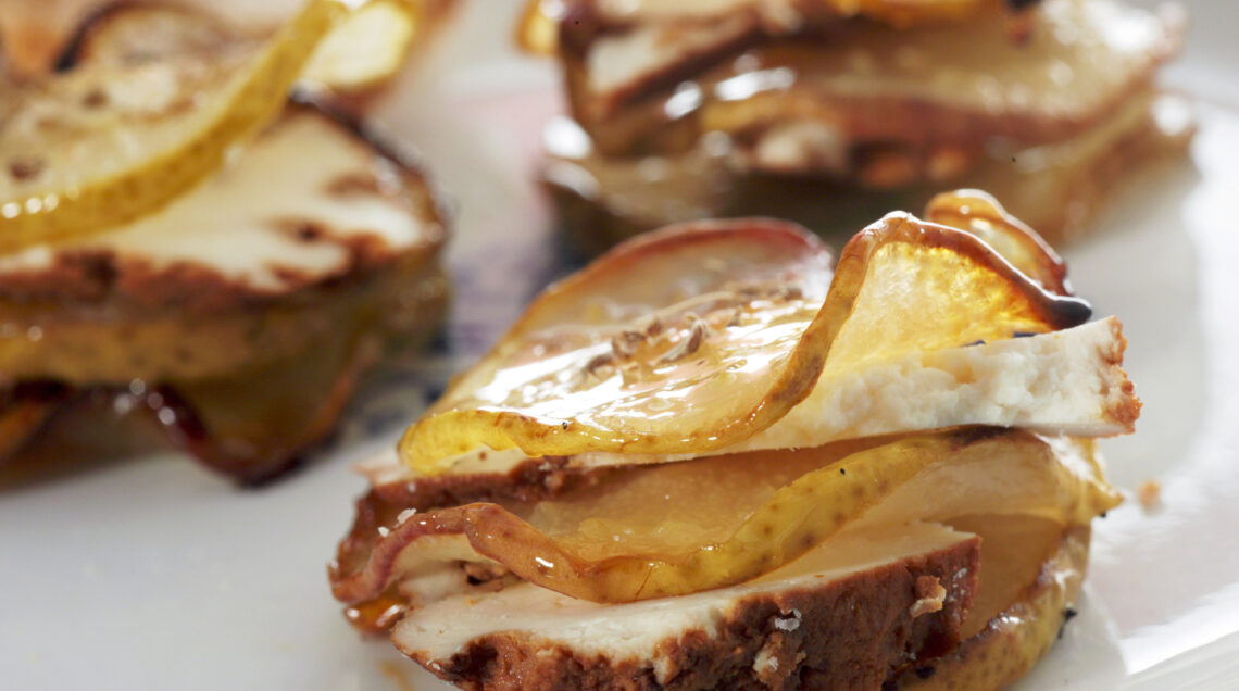 3) Lascia raffreddare le pere per la millefoglie di ricotta e pere e spolverizzaci sopra una presa di semi di cumino pestati, che aiuteranno a conferire al piatto un sapore leggermente speziato. Taglia poi la ricotta a lamelle ed alternane 3 ad altrettante 3 di rondelle di pera.