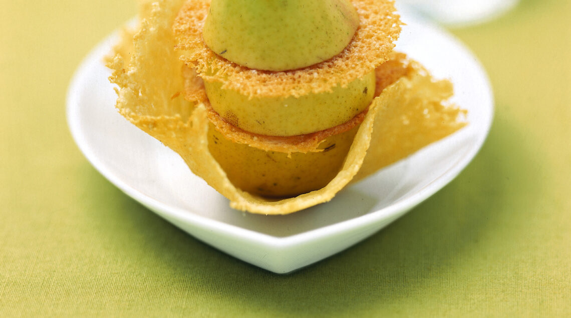 3) Con il resto del grana forma altre 8 cialde piccole e rotonde, poi sistemale tra una fetta di pera e l’altra. Servi le perine estive con sfoglie di grana nei graziosi cestini che hai già preparato.
