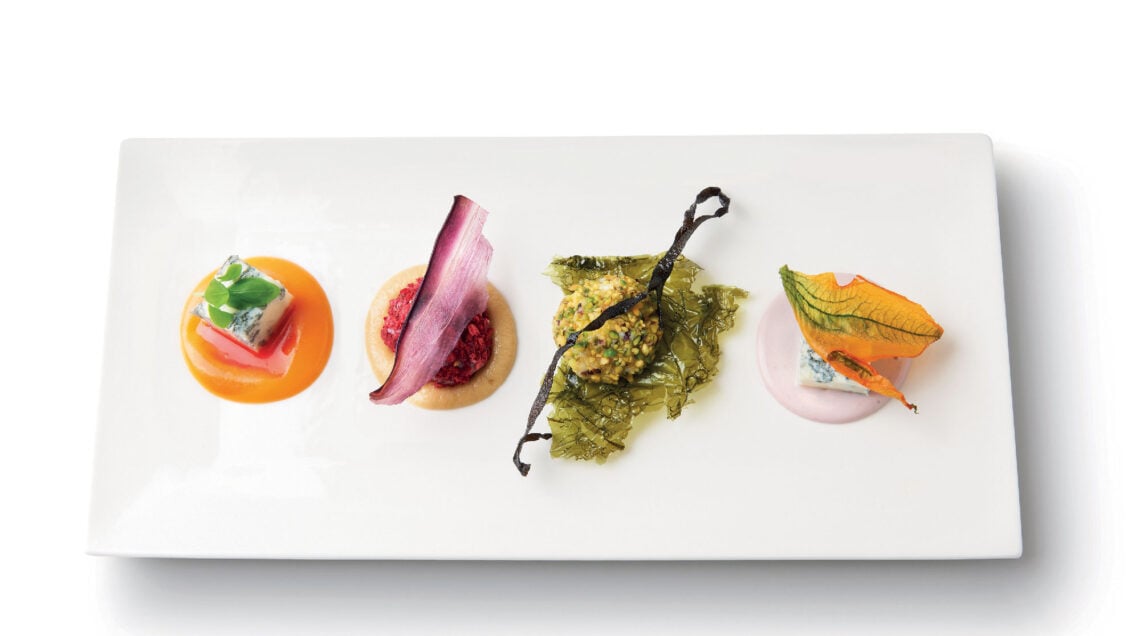 Uva: Tritare finemente il cipollotto e la patata, rosolarli contemporaneamente ed aggiungere l’uva precedentemente pelata e privata dei semi. Sfumare con il vino passito ed una volta evaporata l’alcolicità portare a cottura aggiungendo il brodo vegetale. Una volta pronto frullare emulsionando con olio extra vergine di oliva e passare al colino.