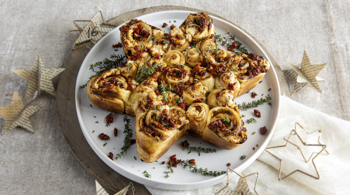 Posizionatene una in piedi al centro di uno stampo di circa 28 cm a forma di stella con 6 punte foderato con carta da forno; disponete le altre 6 spirali sulle punte della stella. Spalmate le 14 strisce di pasta più corte con la farcia rimasta, arrotolatele e posizionatele nello stampo leggermente distanziate. Sbattete il tuorlo con il latte e spennellatelo sulla pasta sfoglia. Cuocete la stella in forno a 200° per 35 minuti. Sfornatela e fatela riposare fuori dal forno per 15 minuti dentro lo stampo; quindi capovolgetela su un piatto e poi giratela nuovamente per trasferirla sul piatto da portata. Spolverizzatela coi pomodori rimasti tritati, qualche rametto di timo e servitela tiepida.