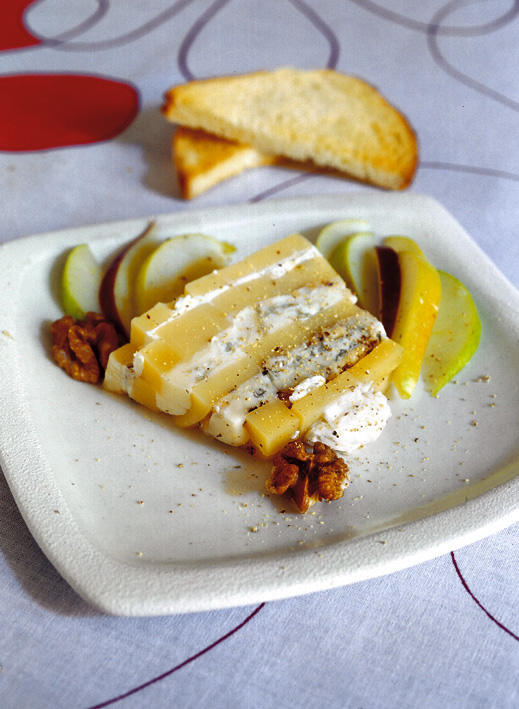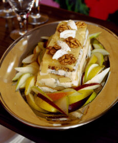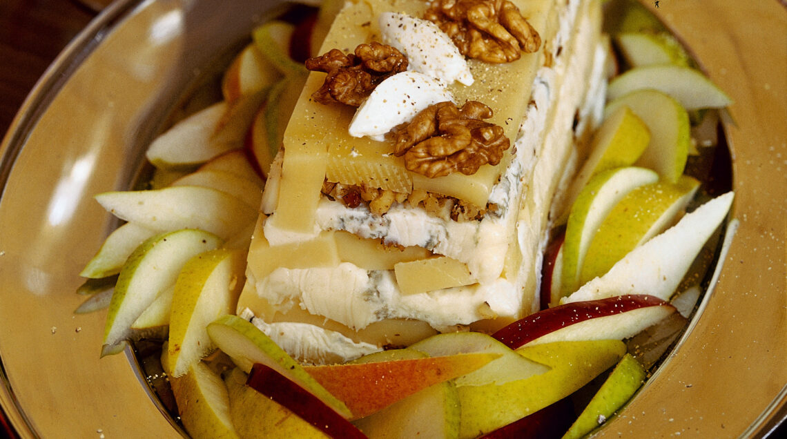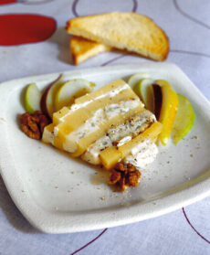 6) Sforma la terrina su un vassoio di portata, decorala con qualche gheriglio di noce e, se ti piace, con qualche ricciolo di caprino. Tagliala a fette spesse circa un cm e servila con gli spicchietti di frutta, cospargendo ogni porzione con una macinata abbondante di pepe.