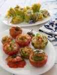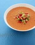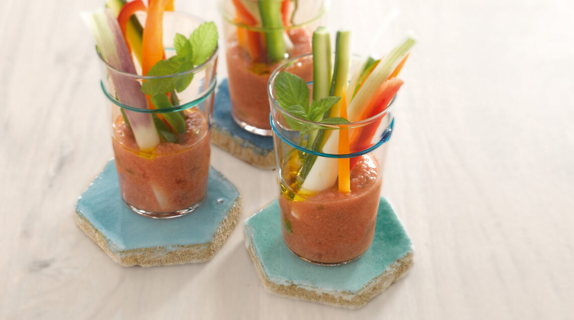 2) Quando il gazpacho si sarà sufficientemente raffreddato, versalo nei singoli bicchieri, aggiungi il pepe, copri con un velo di olio extravergine d’oliva e condisci. Infine aggiungi in ogni bicchiere le zucchine novelle e i cipollotti tagliati a bastoncino e guarnisci con un rametto di menta.
