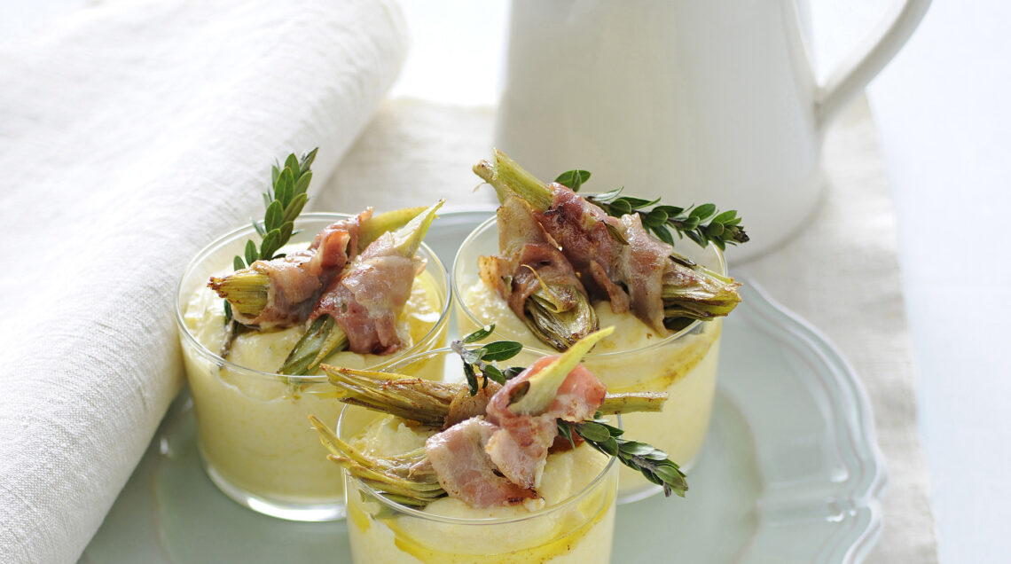 5) Infine distribuisci la crema di polenta in 4 bicchieri o ciotoline, mettici sopra i bocconcini di carciofo al bacon e decora con un rametto di mirto.