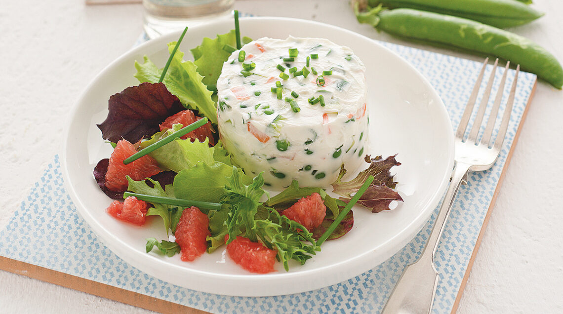 Disponete in una ciotola la misticanza lavata e asciugata, i tocchetti di pompelmo e qualche stelo di erba cipollina tagliuzzato e condite con un cucchiaio di olio e sale. Mettete al centro di un piatto un anello coppapasta, riempitelo con 1/4 del composto di formaggio, compattatelo con il dorso di un cucchiaio e sfilate l'anello. Preparate così altri 3 piatti e completate con l'insalatina preparata.