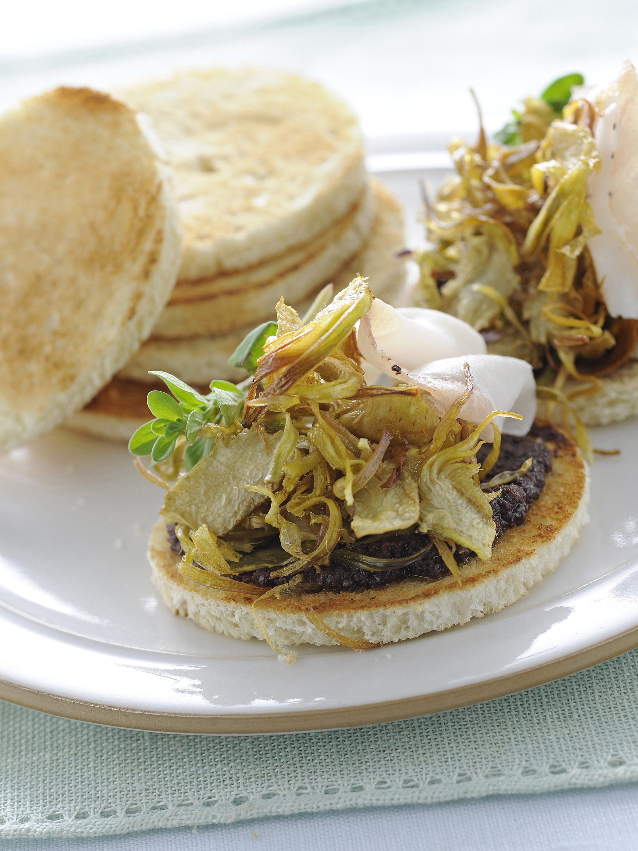 1) Riprendi i dischetti di pane tostato, spalmali di paté di olive e adagia sopra i carciofi fritti, qualche fogliolina di maggiorana, le fettine di lardo (o prosciutto crudo) e una macinata di pepe.