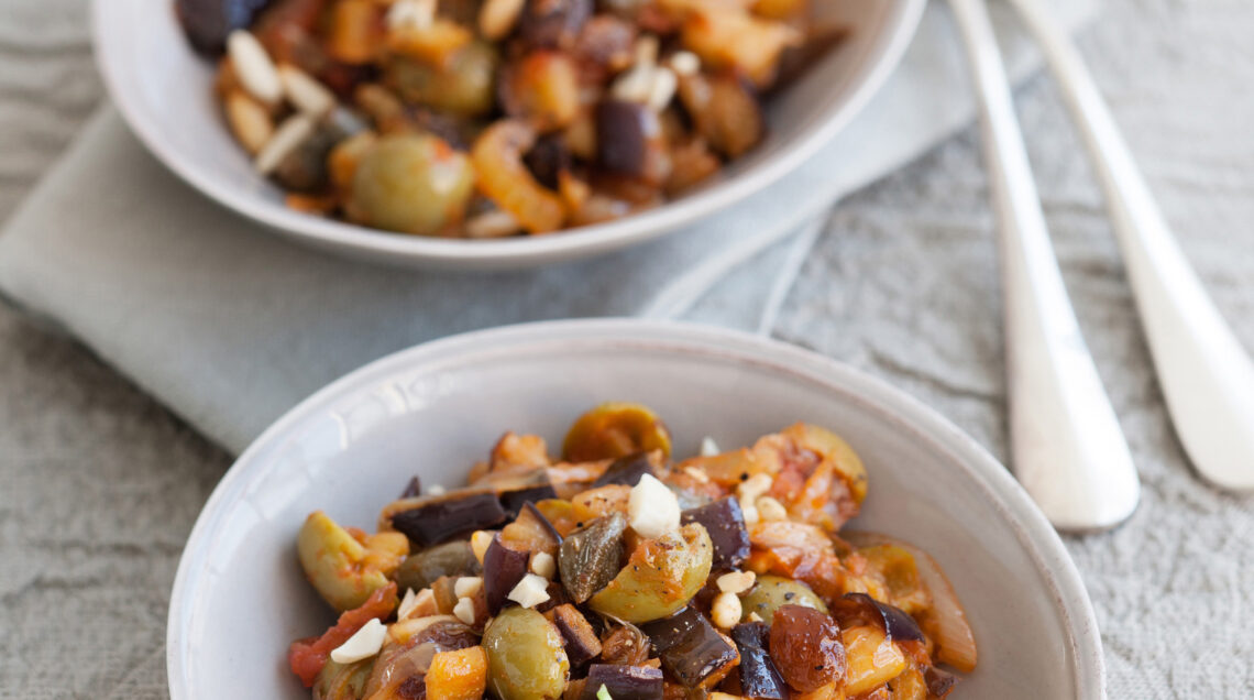 3) Impiatta la caponata alla palermitana, spolvera con la granella di mandorle e servila fredda.
