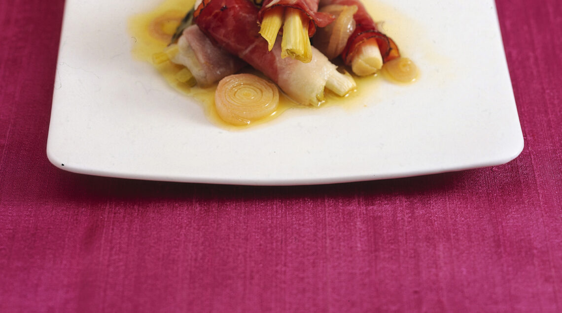 1 Pulite i cipollotti, privateli della guaina esterna e della parte verde. Tagliateli a tronchetti, poi ancora a metà e arrotolateli infine a fagottino nelle fettine di speck.