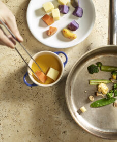 Lavate tutti gli ortaggi. Pelate le patate e tagliatele a dadi di 2 cm. Lessatele in acqua salata: le patate americane per 10 minuti, le altre 5 minuti in più. A parte, scottate le cimette di cavolfiore o broccoletti, mondate, per pochi minuti in acqua salata. Spuntate le taccole, tagliate gli okra in 2 per il lungo e pulite i funghi. In una padella, rosolate in 3 cucchiai di olio la pasta di curry con lo zenzero, pelato e tritato. Dopo qualche minuto, sfumate con il latte di cocco e cuocete perv 10 minuti. Unite una spolverata di coriandolo tritato e fate insaporire per 2-3 minuti. Filtrate la salsa al colino cinese (o in un colino a maglie fitte). Disponete i dadi delle diverse patate in 4 cocottine, su un mestolino di salsa, e riscaldate in forno a 180° 3-4 minuti.