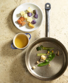 Nel frattempo, fate saltare in una padella gli okra, le taccole e le cimette in poco olio con qualche foglia del coriandolo rimasto. Sfumate con 1 cucchiaio di tamari e 1 di acqua e fate addensare il fondo di cottura.