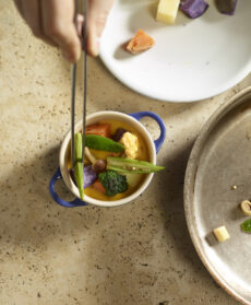 Estraete le cocotte dal forno e guarnite con le verdure saltate. Servite accompagnando, se vi piace, con chapati (sfoglie di pane indiano fritte).
