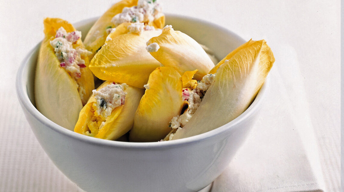 1) Prepara i rotolini di foglie di insalata all’ultimo momento: lava e asciuga l’indivia e farciscila con un po’ di crema di ricotta.