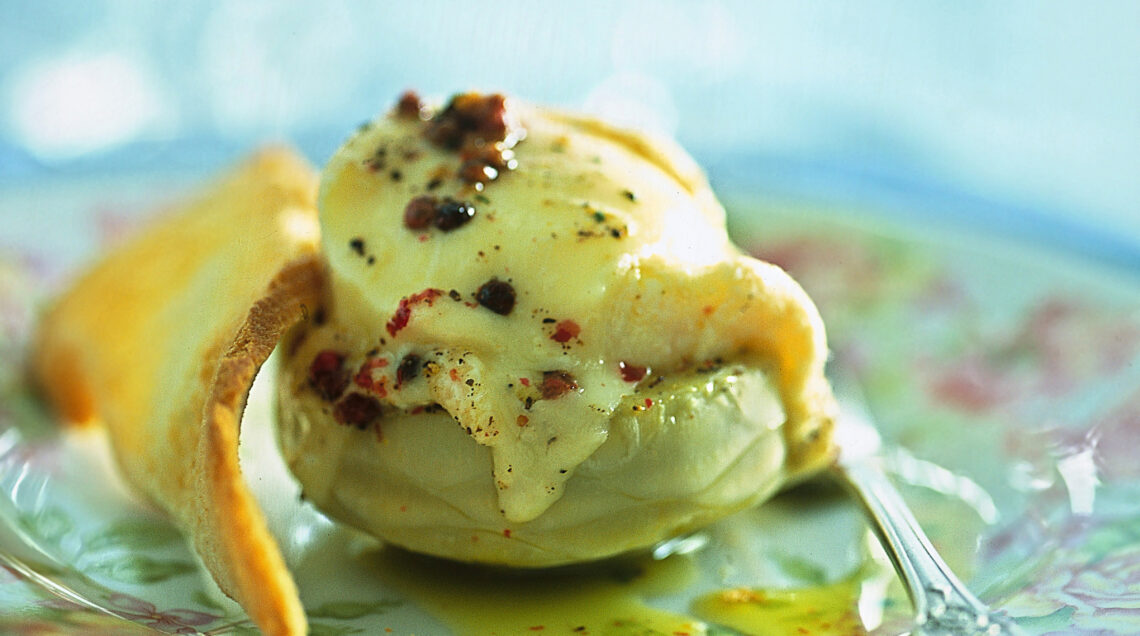 1) Sistema i fondi di carciofo su una placca da forno foderata con carta oleata; sistema in ognuno un caprino e condisci con l'emulsione aromatica appena preparata.