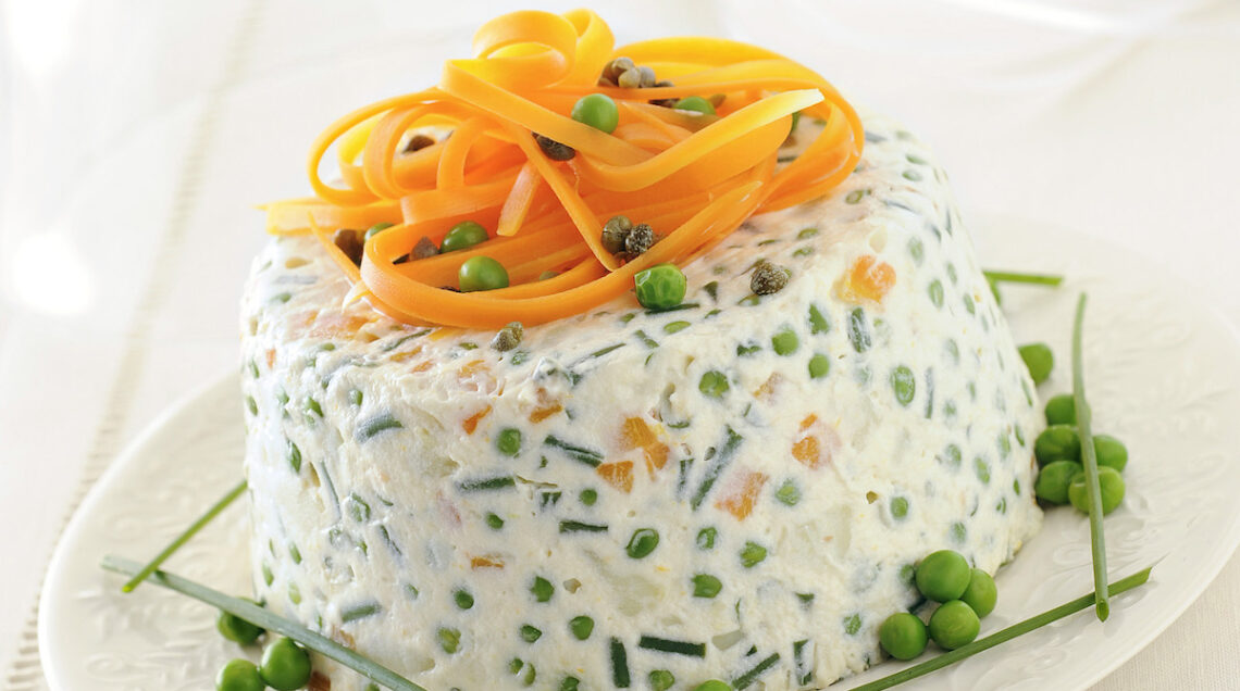 4 Mescolate la maionese di tofu con le verdure e versate il tutto in uno stampo di circa 8 dl di capacità foderato con pellicola. Fate riposare in frigo per 4-5 ore. Sformate l'insalata russa su un piatto, eliminate la pellicola e decorate a piacere con piselli,
