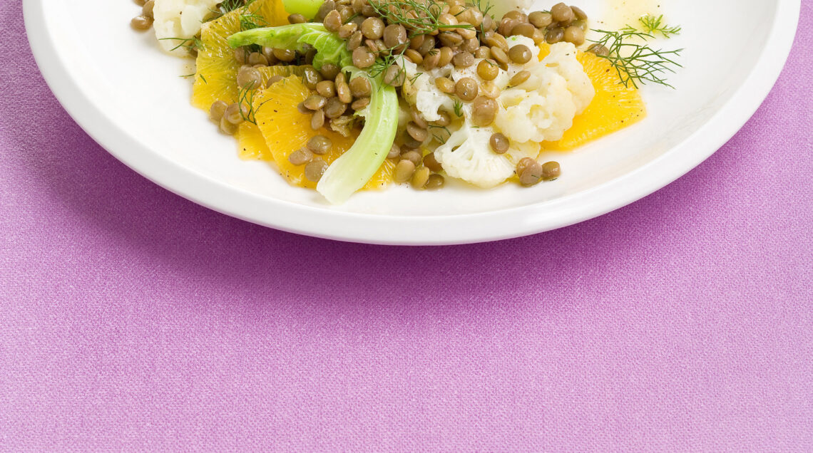 4) Pela al vivo l'arancia rimasta e tagliala a fette orizzontali. Riunisci in una terrina le lenticchie le cimette di cavolfiore lessate e le fette di arancia. Condisci l'insalata di lenticchie e cavolfiore con la salsa all'arancia e finocchietto e lascia insaporire 10 minuti prima di servire.