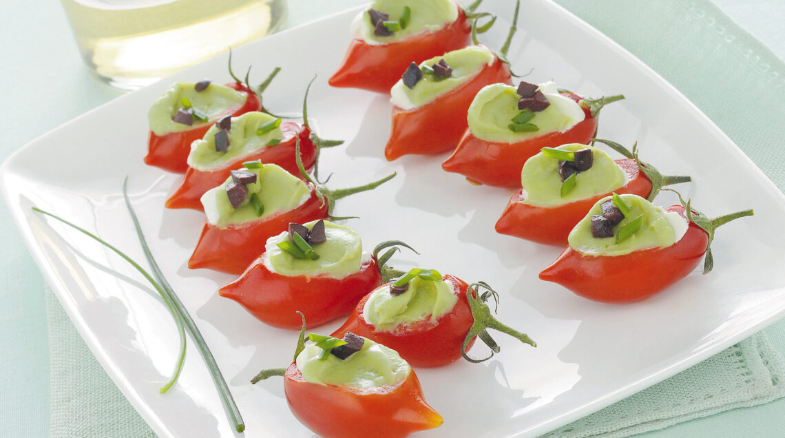 4 Disponete la crema di formaggio nei pomodorini e poi aggiungete anche quella di avocado. Denocciolate le olive, tagliate la polpa a cubetti e distribuitela sui pomodorini ripieni. Completate il piatto con un po’ di erba cipollina ridotta a pezzettini e servite.