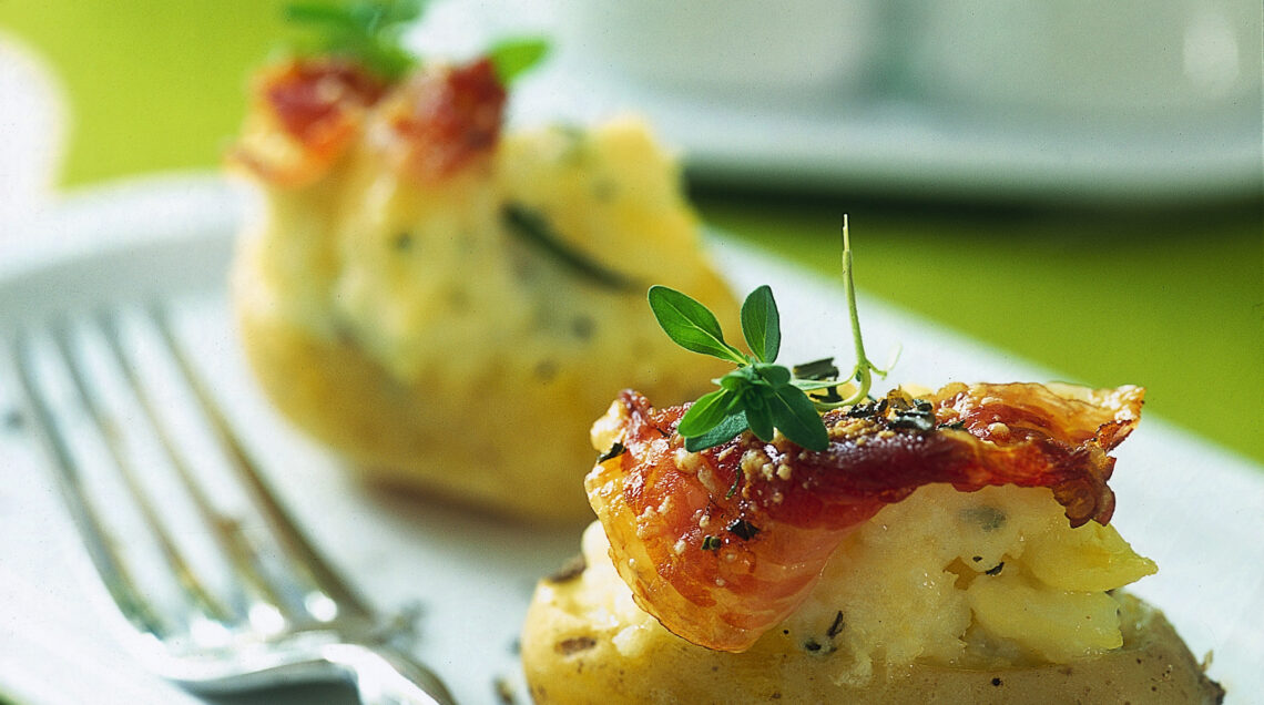 3) Farcisci le patate con il mix appena ottenuto, guarnisci ognuna con una fettina di pancetta, condiscile con un filo d'olio ed infornale a 180° per 15-20 minuti. Servi le tue deliziose patate novelle farcite ancora calde.