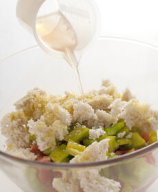 1) Prepara gli ingredienti. Elimina picciolo, semi e nervature del peperone verde e del peperoncino piccante. Tagliali a pezzi con la cipolla e 1 spicchio d'aglio spellati, i pomodori e il cetriolo. Metti tutti gli ortaggi in una ciotola e aggiungi la mollica a pezzi, 0,75 dl di olio, 1/2 dl di aceto e un pizzico di sale. Copri e fai riposare in frigorifero per 12 ore.