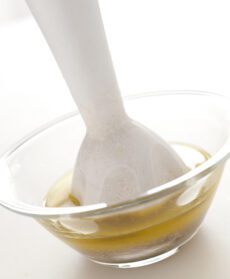 2) Frulla il gazpacho. Trasferisci il tutto in un contenitore alto e capiente, aggiungi 1 dl di acqua gelata e frulla con il frullatore a immersione. Versa a filo 0,75 dl di olio, alternandolo con l'acqua minerale rimasta fredda (1,5 dl), continuando sempre a frullare. Passa l'emulsione ottenuta al setaccio. Versane una piccola parte in uno stampo per cubetti di ghiaccio e metti in freezer. Conserva il gazpacho rimasto in frigo.