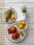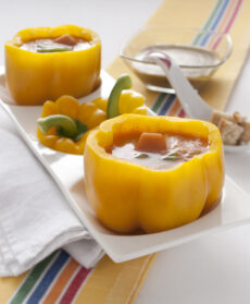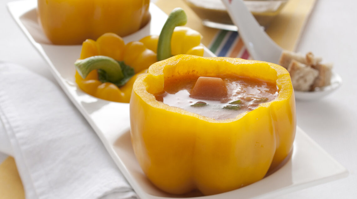 3) Completa e servi. Taglia la calotta ai peperoni gialli ed elimina semi e nervature. Lavali e asciugali. Metti un colino nel lavello e, stando sopra di esso, dissala le acciughe sotto acqua fredda corrente. Inserisci il dito indice nel ventre per togliere la lisca e i residui di interiora, lasciando cadere gli scarti nel colino. Metti i filetti a bagno in acqua e aceto per 5 minuti. Frulla le acciughe sgocciolate con lo spicchio d'aglio rimasto a pezzetti, l'olio rimasto (1 dl) e 1 cucchiaio di aceto, in modo da ottenere una salsa omogenea. Versa il gazpacho nei peperoni e aggiungi i cubetti di gazpacho ghiacciato. Servi, a piacere, con cubetti di pane tostato, dadini di cetrioli e cipollotti e pomodori a pezzetti. Un consiglio per gustare meglio questo piattno è quello di tagliare il peperone a listarelle e di intingerle nella salsa all'acciuga.