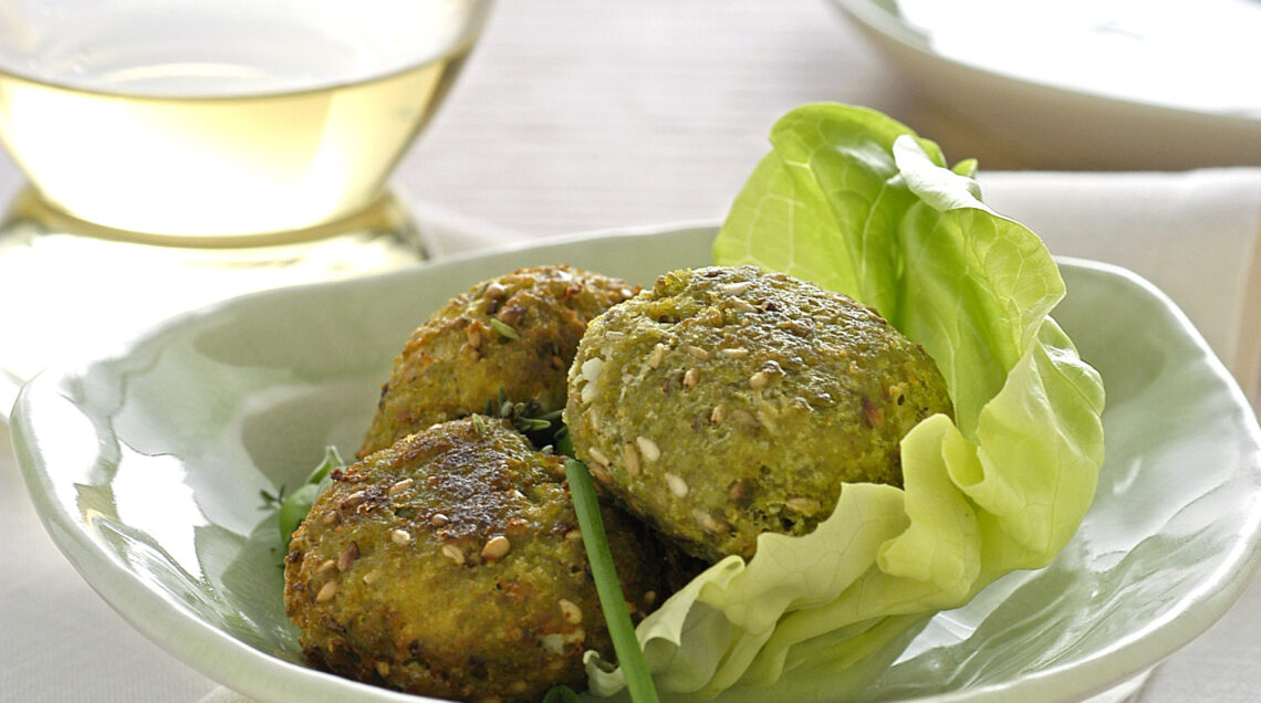 3) Friggi le polpette per circa mezzo minuto per lato fino a quando risultano dorate e croccanti e scolale su carta assorbente da cucina. Servi le polpette di piselli con feta e sesamo calde oppure leggermente intiepidite su un letto di tenere foglie di lattuga.